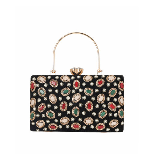 Designed with a soft fabric base, it features a golden embellished handle and a stunning stone-studded circular design in front. Compact yet spacious, it can easily hold your essentials like phone, wallet, and makeup. Features...