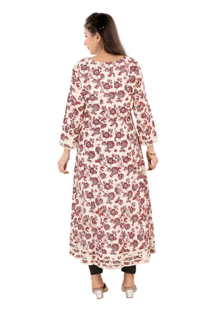 | Upgrade your ethnic wardrobe with the elegant AIKAA Women’s Cotton Anarkali Floral Printed Kurti, designed with a beautiful flare, charming maroon floral patterns, and a stylish embroidered V-neckline. Crafted from soft, breathable cotton fabric, this kurti offers unmatched comfort for daily wear, office, casual outings, or festive gatherings. The 3/4th sleeves and intricate detailing at the neckline and hemline give it a graceful and premium appeal. Pair it with leggings, palazzos, or denim to create a versatile and trendy ethnic look. |